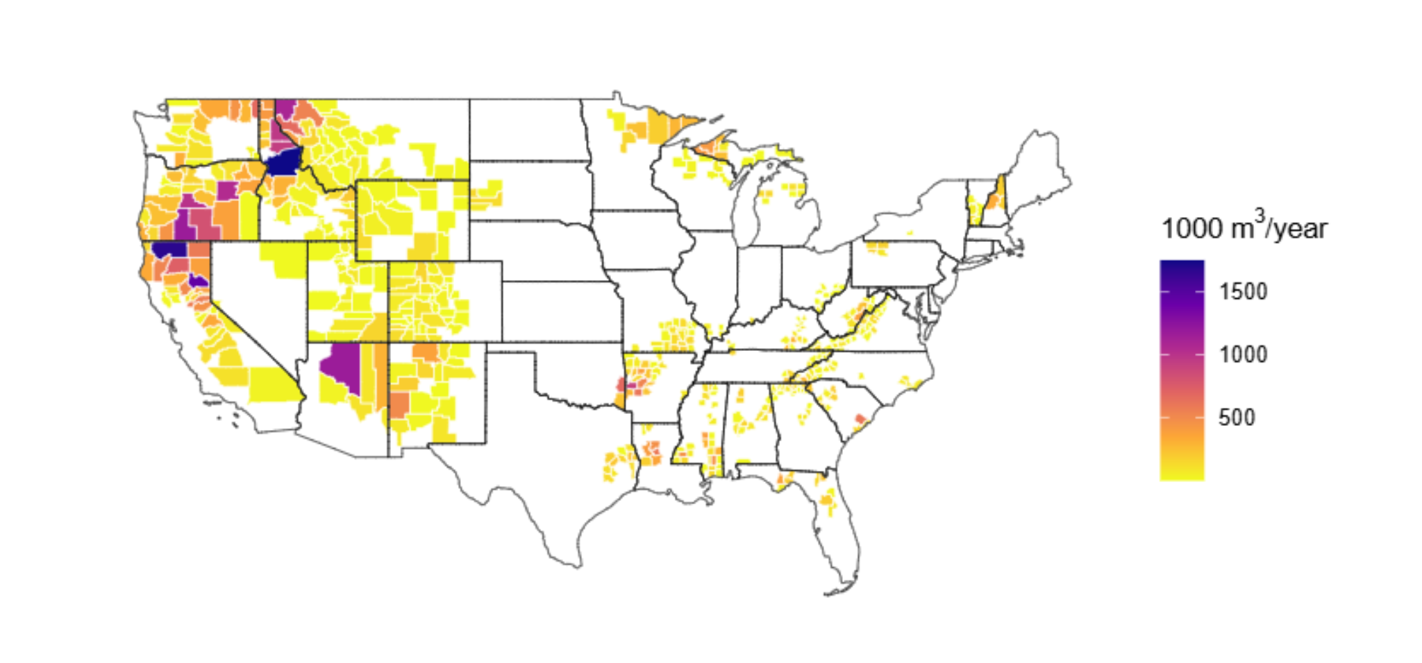 Figure 1 maps the annual harvestable volume from federal lands, by county. To contextualize this, in 2024, the Forest Service reported that approximately 6.8 Mm³ were harvested and sold from federal forests.