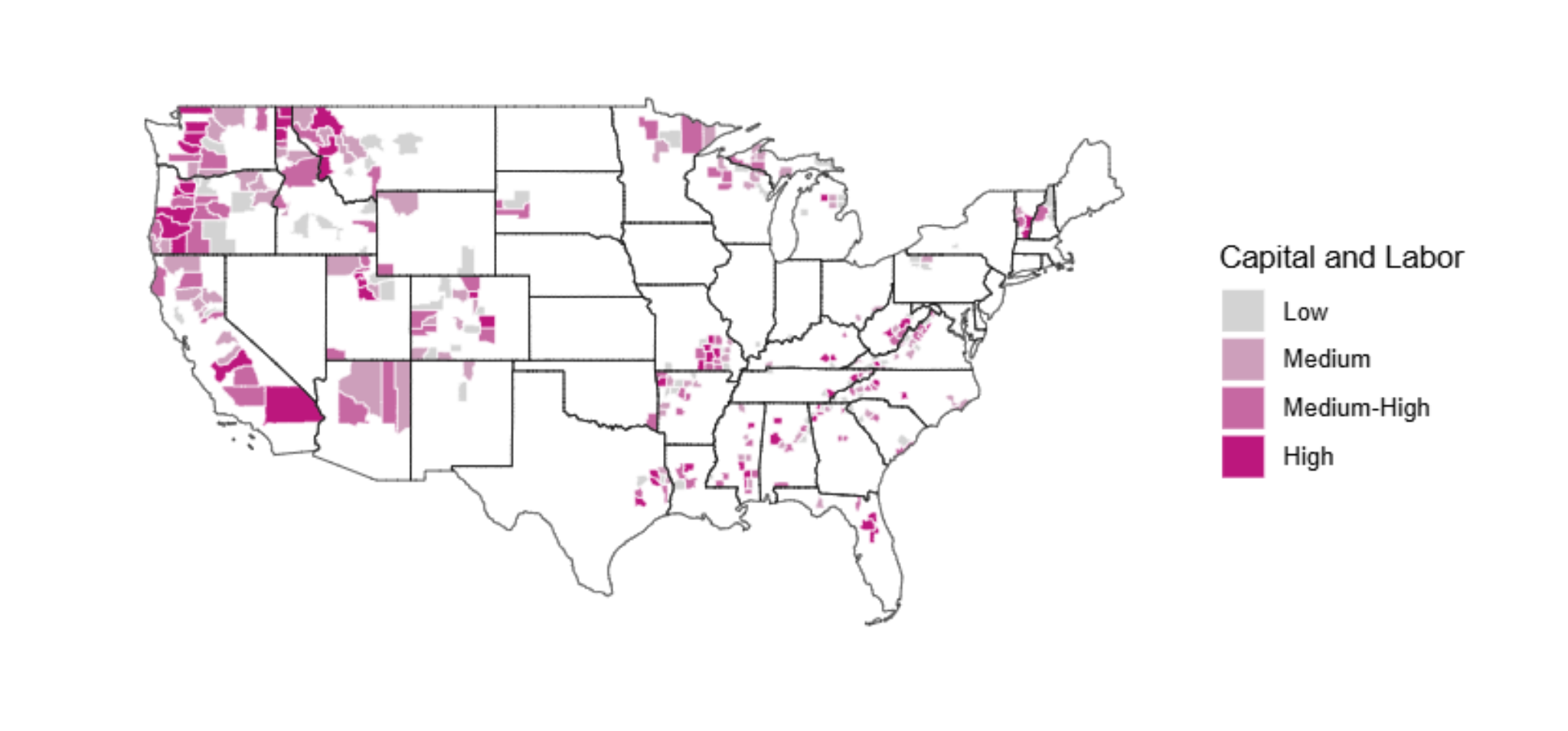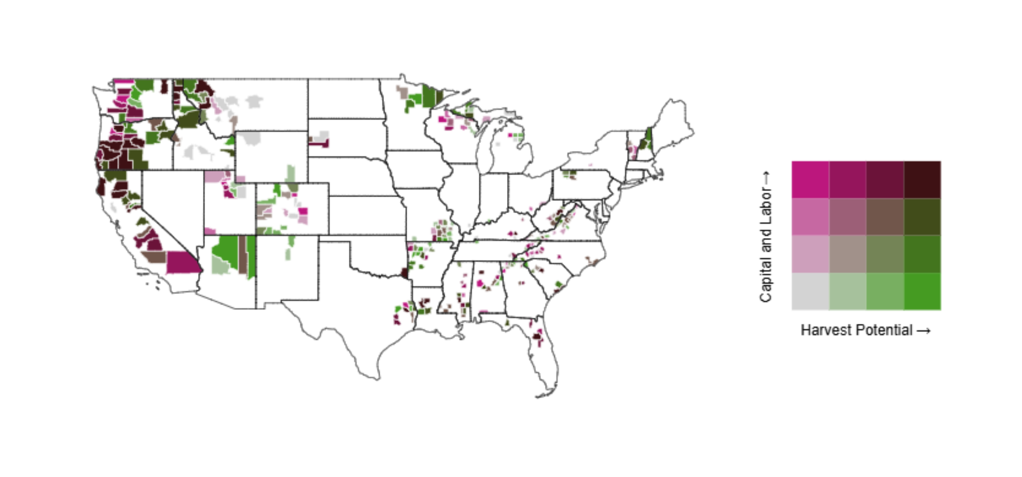 Some counties, especially in the Pacific Northwest (PNW), emerge as high-potential locations where existing mills and labor could rapidly support increased harvesting. Conversely, high-volume but low-capacity areas will need targeted investment in labor and physical capital.