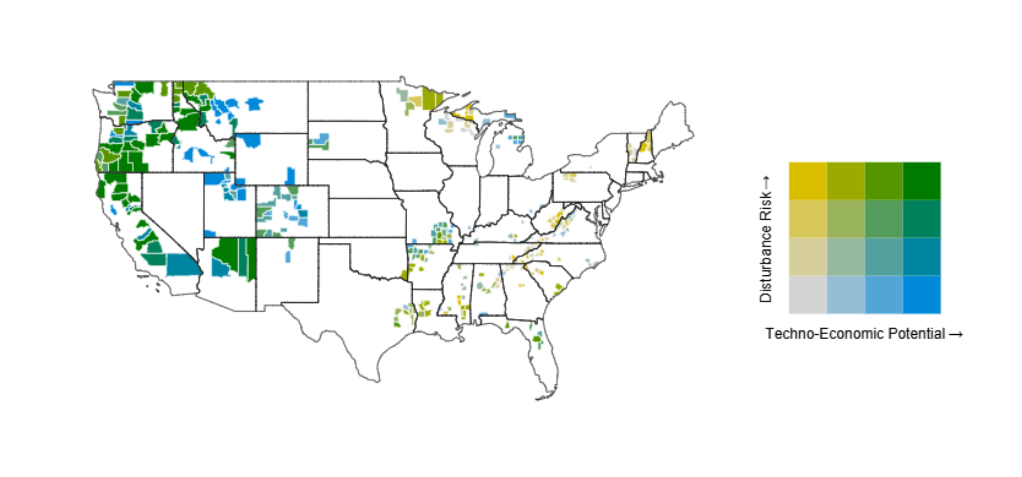 Figure 4 highlights areas where techno-economic potential overlaps with forests projected to be at risk from natural disturbances, based on an overlay of the combined results from Figure 3 with projected forest losses in 2030 from natural disturbances from Anderegg et al. 2022.