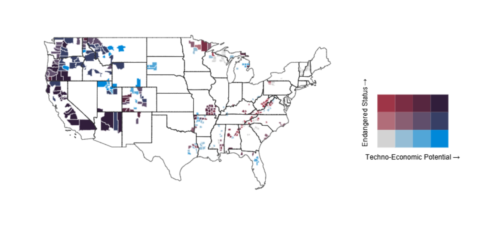 To explore these trade-offs, we overlaid our timber potential map (Figure 3) with geographic data on endangered species habitats and presented in Figure 5. We classified areas into three endangerment status categories: areas without any threatened or endangered species territory were designated as “safe”; areas with threatened species territory were designated as “threatened”; and areas with endangered species territory were designated as “endangered.”